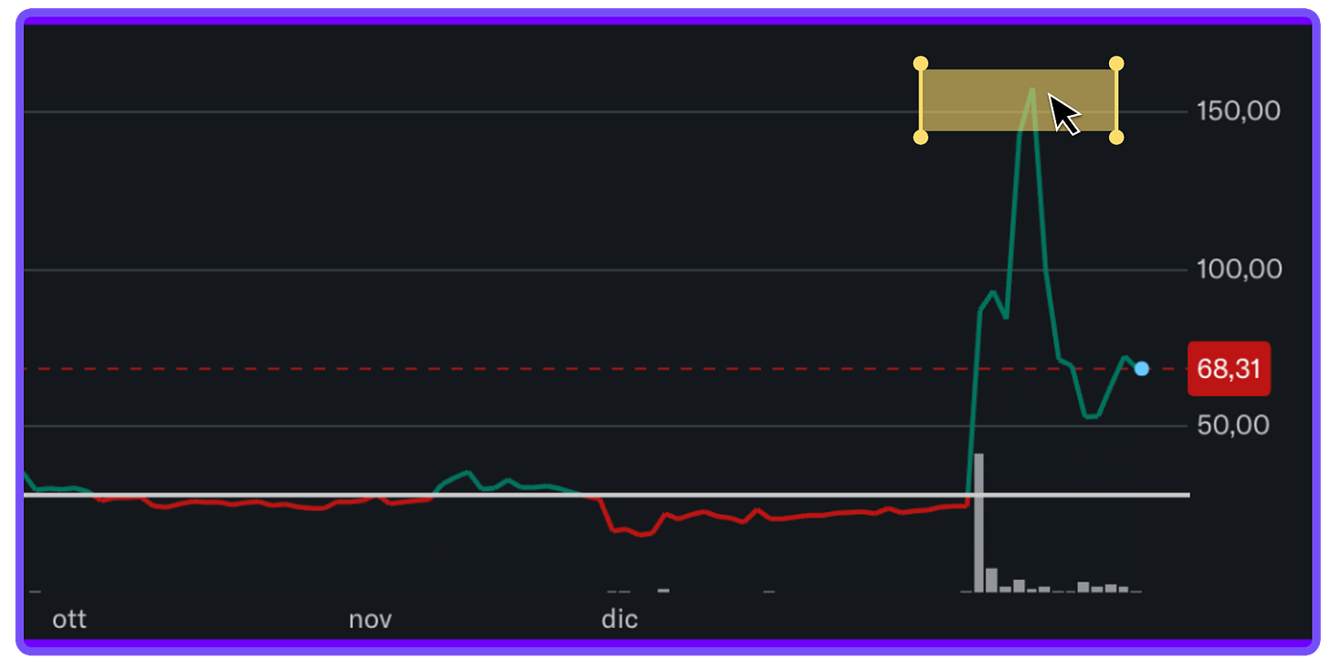 Il titolo di Rich Sparkle, che al primo gennaio valeva $22 per azione, è schizzato a $180 per azione nei due giorni successivi all’annuncio, per poi ridiscendere a $70 perdendo il -60%. Se il mercato continua a ridimensionare le aspettative, il rischio è che il titolo torni su valori «normali» (20$)