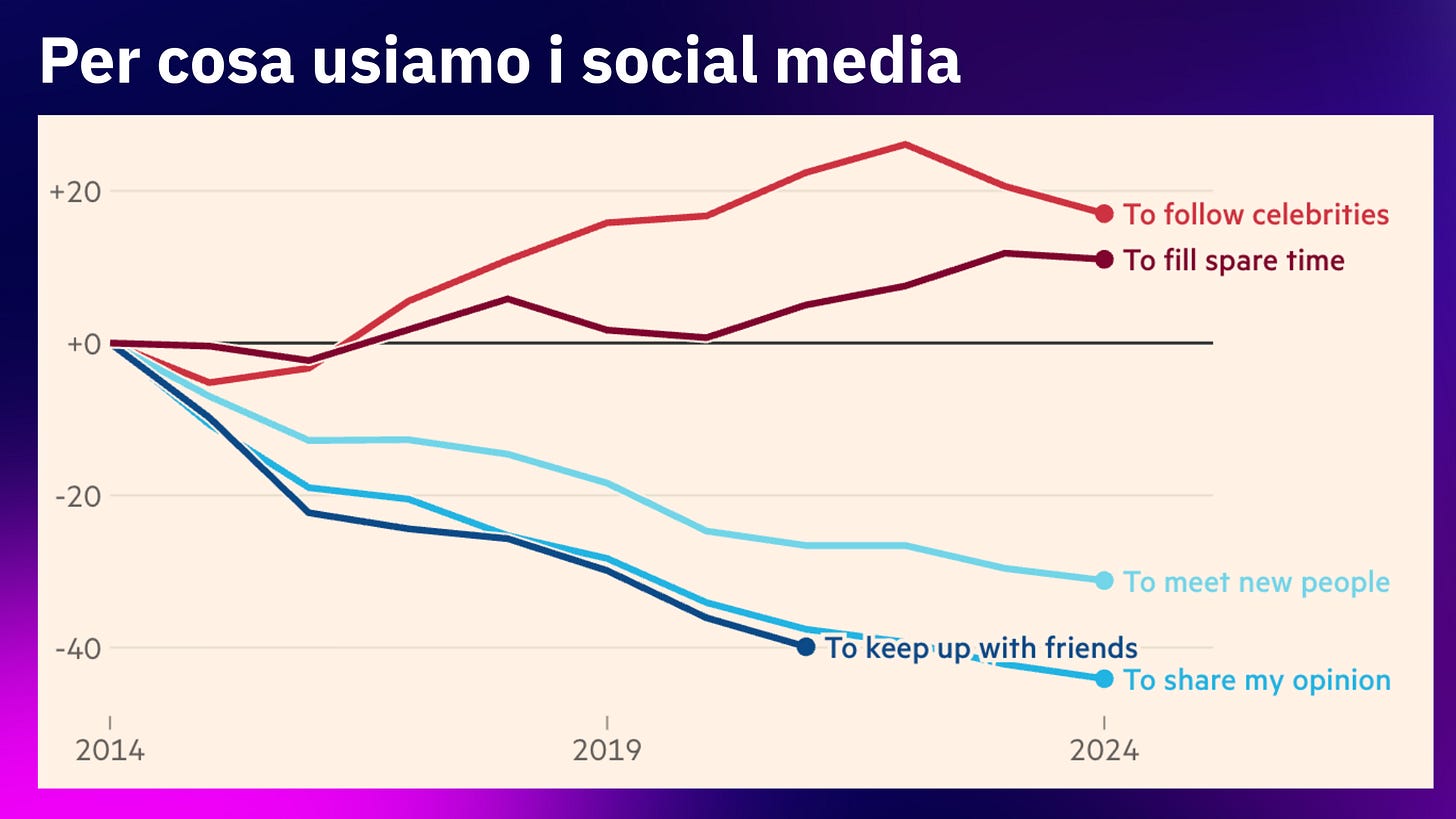 Il Financial Times parla di «antisocial media»: sovraccarichi da informazioni, tossicità e paura di shitstorm scatenate dalle varie Fragolina88 e Bulldozer79, sempre più persone stanno rimpiazzando la creazione di contenuti e le interazioni con lo scrolling infinito e passivo di video leggeri ma ipnotici.